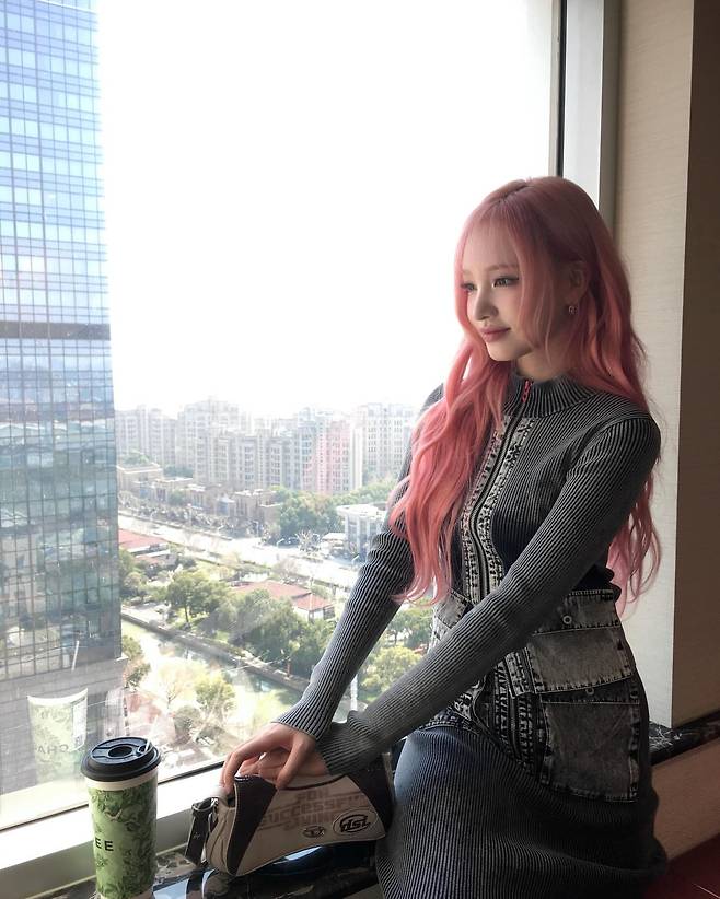 리즈는 고층 빌딩이 내려다보이는 실내에서 블랙 스트라이프 니트 톱과 데님 스커트를 매치한 캐주얼 시크 룩을 연출하고 있다. 특히 핑크빛 장발과 어우러진 모던한 스타일링이 도시적 감성을 극대화하고 있으며, 창가의 자연광과 조화를 이루며 세련된 분위기를 완성하고 있다.