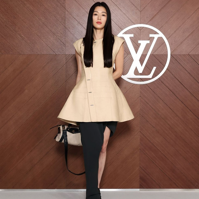 전지현 역시 전 세계 패션인의 이목이 집중된 자리에서 스커트 팬츠 룩을 선택했다. 루이비통의 2025 SS 컬렉션 룩 중 하나였지만, 보는 이들 사이에선 아쉬움 섞인 반응이 이어졌다.