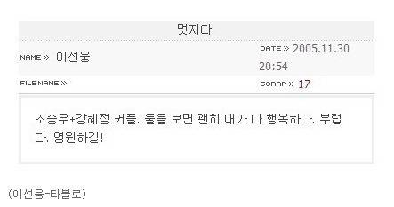 당시 조승우와 강혜정은 <연애의 목적>을 통해 가까워졌고, 이후 공개 연애를 시작했다.