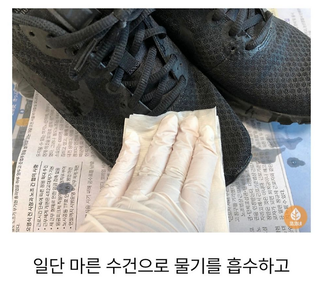마른 수건을 이용해 운동화의 겉과 안을 꾹꾹 눌러가며 닦아줍니다.