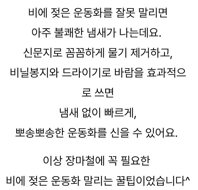 그래서 오늘은!젖은 운동화를 빠르고 효과적으로 말리는 법, 그리고 냄새 없이 보송하게 유지하는 꿀팁까지한 방에 정리해 드릴게요!
