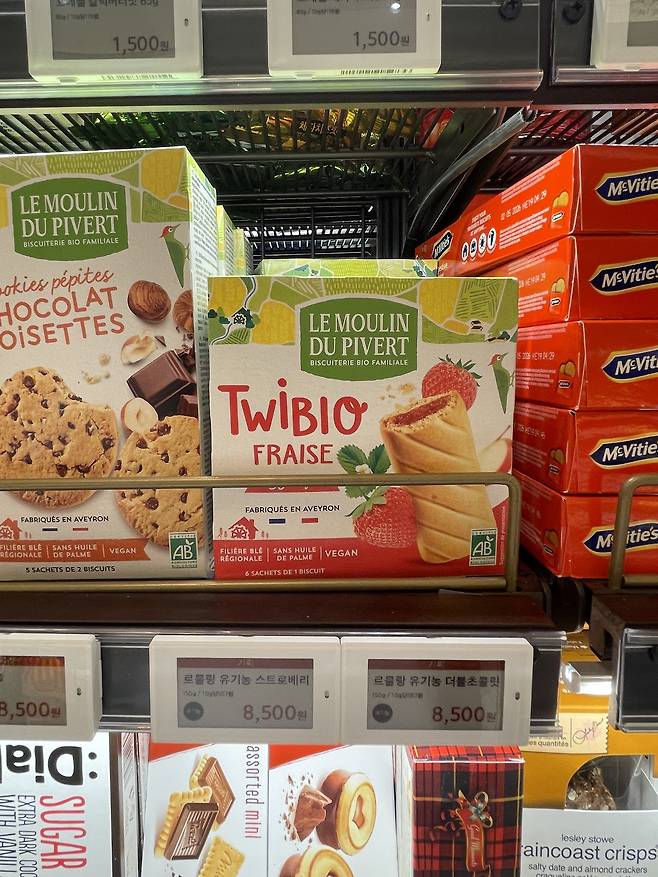 프랑스 유기농 브랜드 르 물랭 뒤 피베르의 트위비오 딸기(Twibio Fraise)는 상큼한 딸기잼을 채운 바삭한 비스킷이에요.
