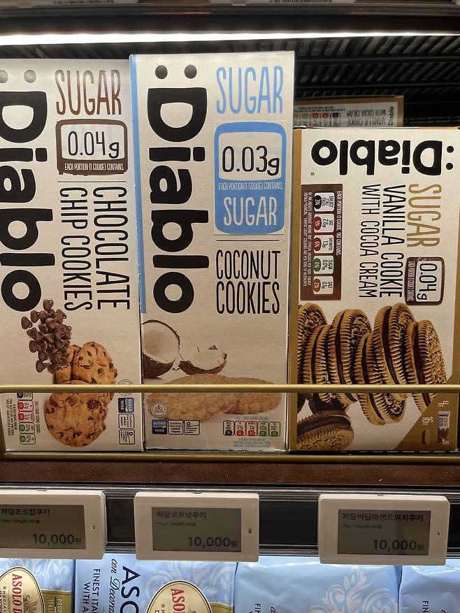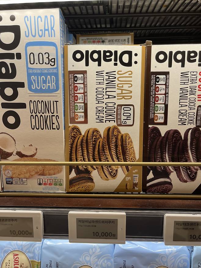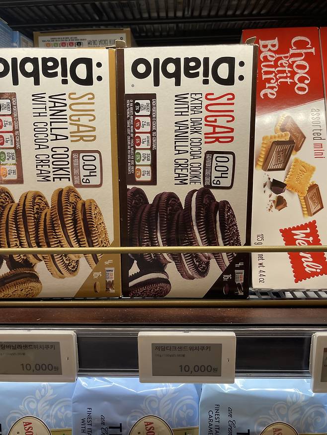 디아블로 저당 바닐라 샌드위치쿠키는 진한 코코아 크림을 바닐라 쿠키로 샌드한 제품으로, 당류 0.04g만 함유했어요.