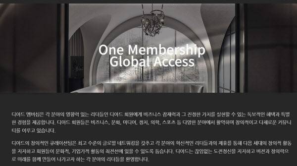 디아드로 소유권과 사업 운영권이 넘어가면서 디아드는 멤버십 모집 대상을 확대했다. 당초 신유씨앤디가 ‘아스턴55’ 등 강남 하이엔드 주거시설 계약자를 대상으로 전용 커뮤니티를 운영할 계획이었으나 현재는 주거시설 계약자가 아니더라도 멤버십 가입이 가능한 상태다. 개인은 보증금 10억원, 법인은 12억원을 내야 가입할 수 있는 초고가 회원제다. 연 회비는 별도로 있다. 비용은 1000만원이다.