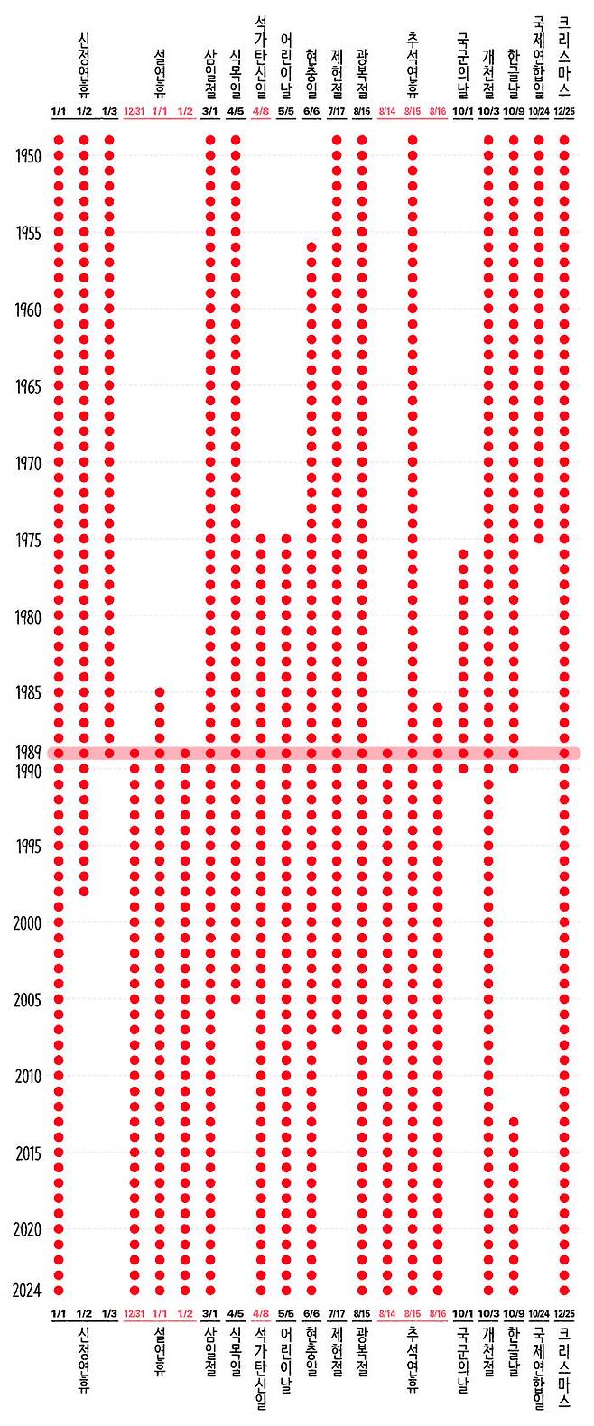 우리나라의 공휴일 역사는 '관공서의 공휴일에 관한 규정'의 변화와 함께하고 있어요. 이 규정이 1949년 만들어졌는데 이때만 하더라도 우리나라의 법적공휴일(일요일 제외)은 11일뿐이었죠. 당시엔 1월 1일 신정에 하루만 쉬는 게 아니라 1일부터 3일까지 이어지는 연휴였고, 음력 1월 1일 설은 법적공휴일이 아니었다는 사실! 추석도 음력 8월 15일 딱 하루만 쉬었습니다. 아래 그림을 보면 1949년부터 2024년까지 법적공휴일이 어떻게 변해왔는지 알 수 있을 겁니다.