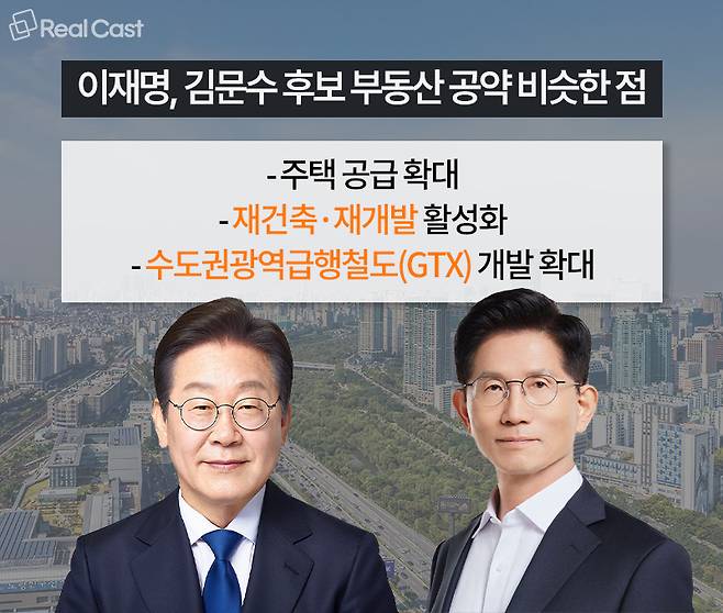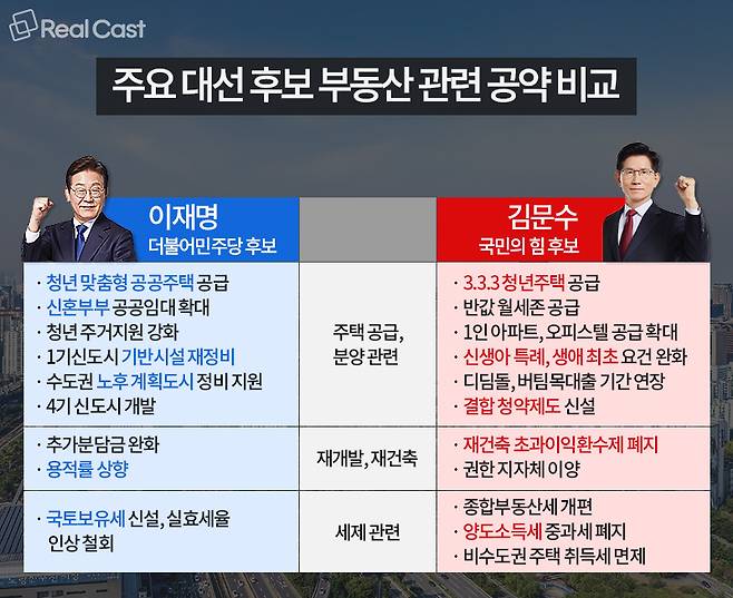 - 이재명 후보: 1기 신도시 재정비, 공공임대 확대, 4기 신도시 건설 등