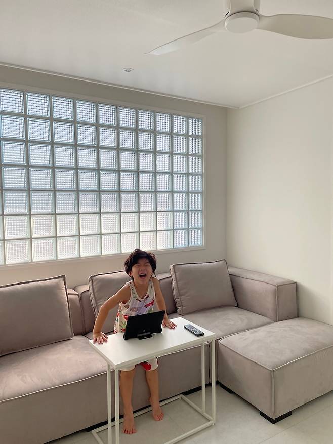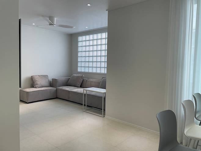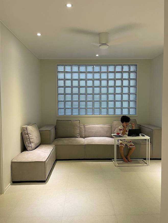 우리 집의 작고 아담한 거실이에요! 거실의 포인트는 바로 유리 벽돌이에요.