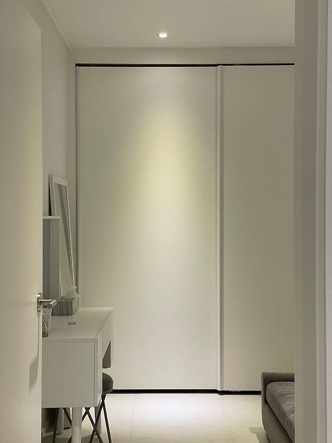 평수가 작고 방이 두 개밖에 없다 보니 수납공간이 너무 부족해서 방 한쪽 면을 모두 붙박이장으로 만들었어요. 그리고 침대와 화장대만 있는 딱 깔끔한 안방이랍니다.