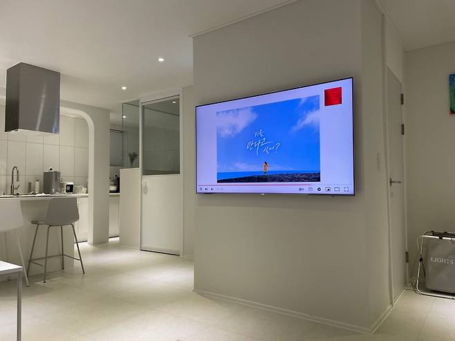 TV를 설치할 공간이 마땅치 않아서 많은 고민 끝에 세탁실 벽 쪽으로 위치를 잡고 공사를 시작했어요! 다행히 전 집에서 사용하던 TV 사이즈와 벽 사이즈가 딱 맞아떨어져서 액자를 달아둔 것 같은 느낌이 들어요^^