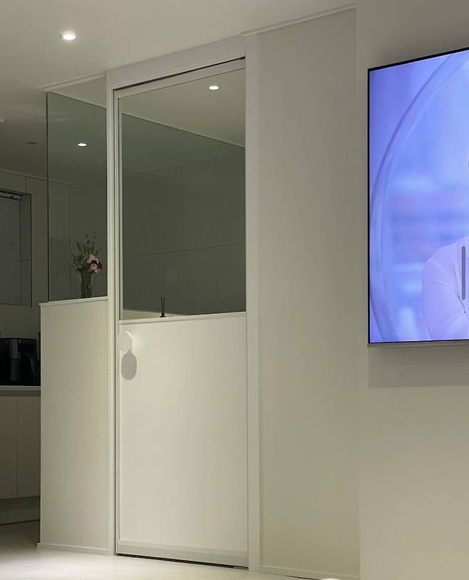 주방 바로 오른쪽으로는 현관이 있어요. 이 부분도 가벽을 치는 것보다 유리로 하면 더 넓어 보일 것 같아서 전면 유리와 중문에도 유리의 비중을 조금 더 두었어요! 덕분에 답답해 보이지 않고 넓어 보이면서 세련된 현관이 완성되었답니다.