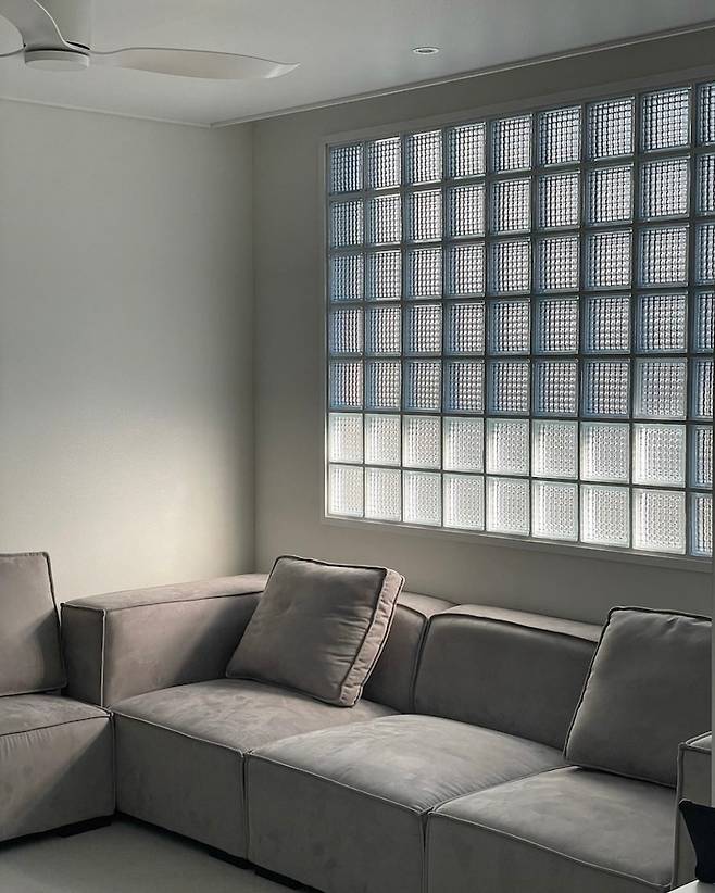우리 집의 작고 아담한 거실이에요! 거실의 포인트는 바로 유리 벽돌이에요.