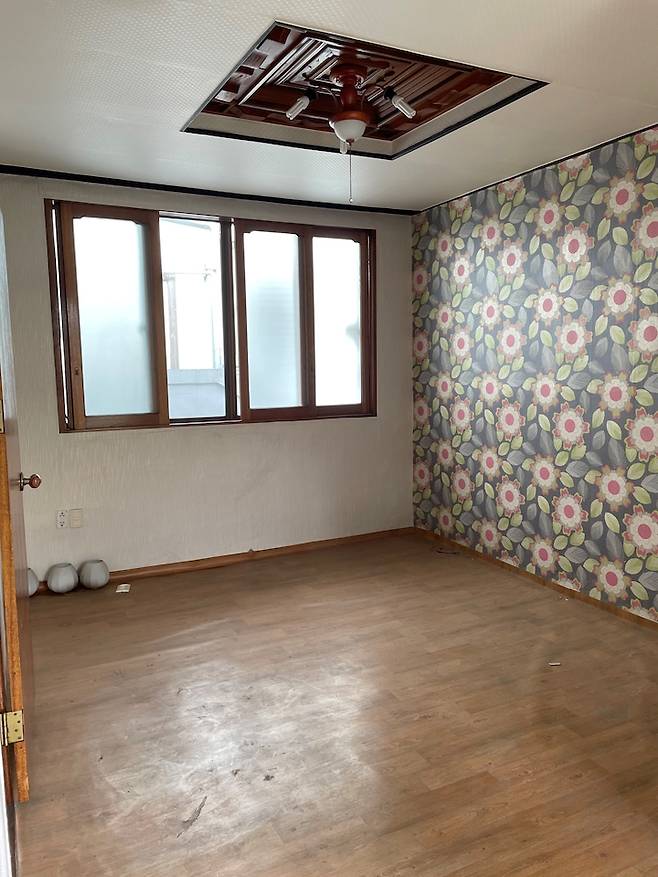 지금 모습은 전혀 찾아볼 수 없는 이층 거실이에요. 오래된 바닥과 벽지들 그리고 보일러실이 있는 자리에는 작은 문과 현관이 있었어요!