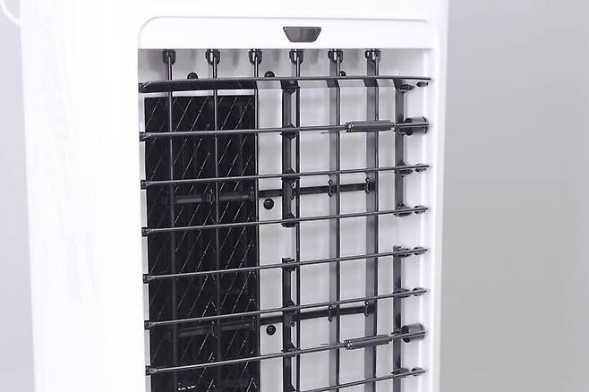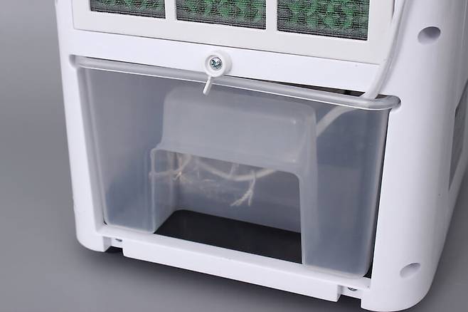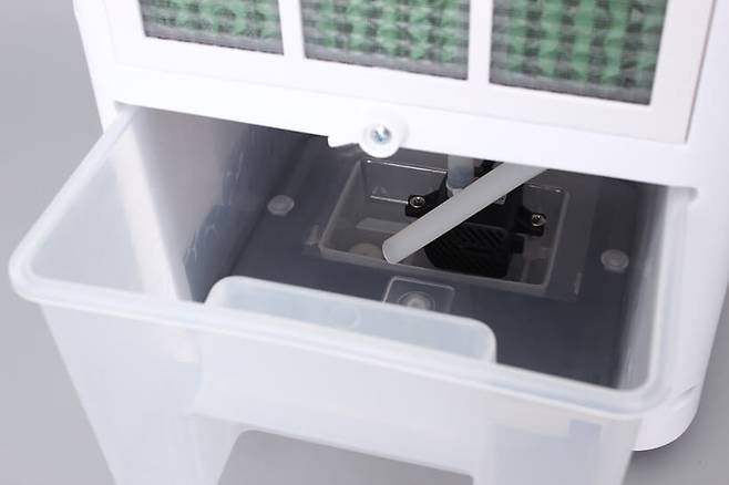 먼지 필터 안쪽에는 녹색으로 된 워터 필터가 있다. 물이 흘러내리면서 수분을 머금게 되는 워터 필터는 직선이 아니라 곡선으로 이루어져 공기 접촉 면적을 늘려주고 있다. 먼지 필터와 워터 필터는 사용 후 물로 세척해서 재사용이 가능하다.