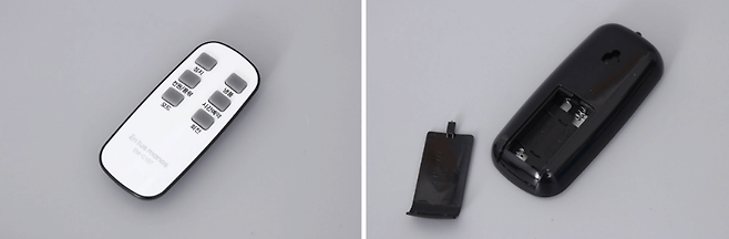 조작부에서 설정할 수 있는 모든 기능은 리모컨으로도 설정 가능하다. 리모컨에는 조작부에 있는 여섯 개의 버튼이 모두 구비되어 있기 때문이다. 리모컨은 AAA타입 배터리 2개를 집어넣고 사용하면 된다.