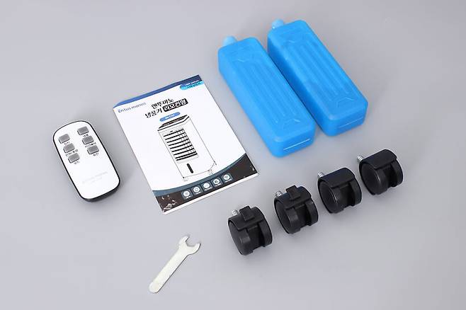 엔뚜마노 리모컨형 냉풍기 EM-C10T의 구성품은 두 개의 냉매팩과 네 개의 이동 바퀴, 리모컨, 스패너, 그리고 사용 설명서로 이루어져 있다.