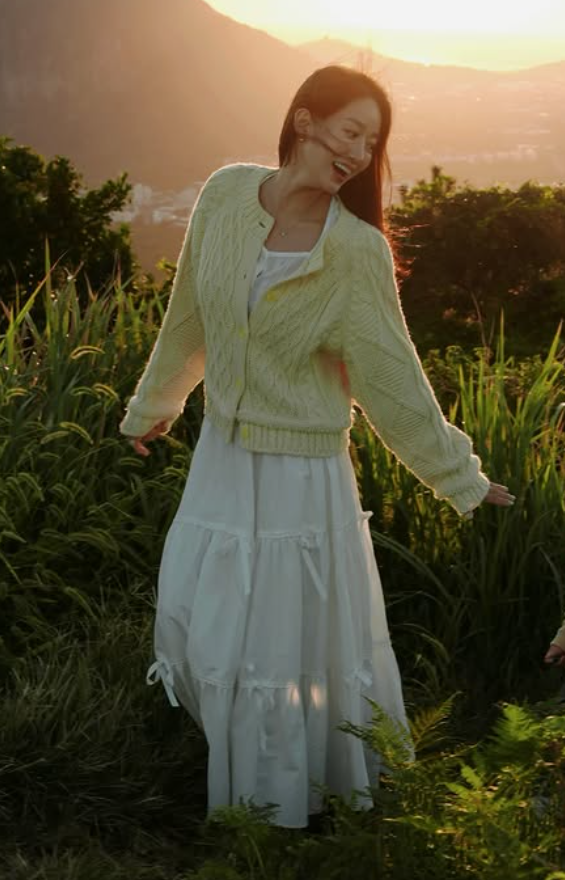 가디건 안에는 화이트 컬러의 롱 원피스를 매치했어요. 심플하면서도 우아한 분위기를 연출할 수 있는 아이템이죠. 롱 원피스 특유의 부드러운 실루엣이 전혜빈 님의 청순하고 러블리한 매력을 한층 더 돋보이게 했어요. 카디건과 원피스 조합은 언제나 실패 없는 조합이라, 누구나 도전하기 좋은 스타일이에요!