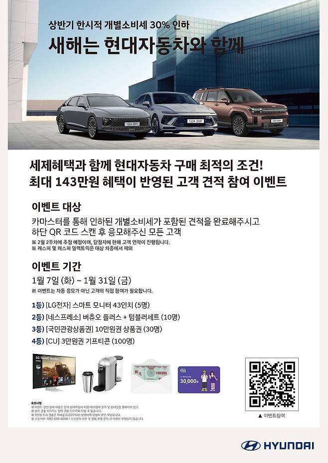 이와 함께 소비자 관심 유도를 위해 7일부터 31일까지 약 한 달 동안 신차 견적을 진행하고 이벤트에 참여하는 고객들을 대상으로 추첨을 통해 LG스마트모니터, 네소프레소 버츄오 세트, 국민관광상품권, CU기프트콘을 제공한다.