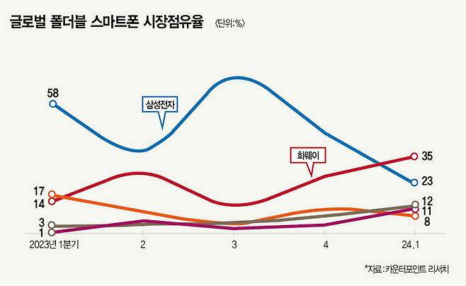 단순히 부활에만 성공한 게 아니다. 더 강한 기술력으로 돌아왔다. 중국 업체가 따라오기 힘들다고 내다봤던 폴더블폰 시장에서 올 1분기 화웨이가 세계 시장점유율 1위를 차지했다. 화웨이는 전년 동기 대비 3배에 달하는 급성장세를 보이며 강력한 경쟁자 삼성전자를 끌어내렸다.