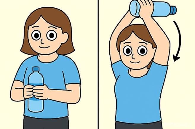 이부분을 자극하려면 가벼운 물병이나 페트병을 들고 위로 들어 올리는 ‘오버헤드 익스텐션’ 동작이 효과적이다. 양손으로 물병을 들고 머리 뒤로 넘긴 다음, 팔꿈치를 구부려 내렸다가 다시 올리는 동작을 15회씩 3세트 반복한다.