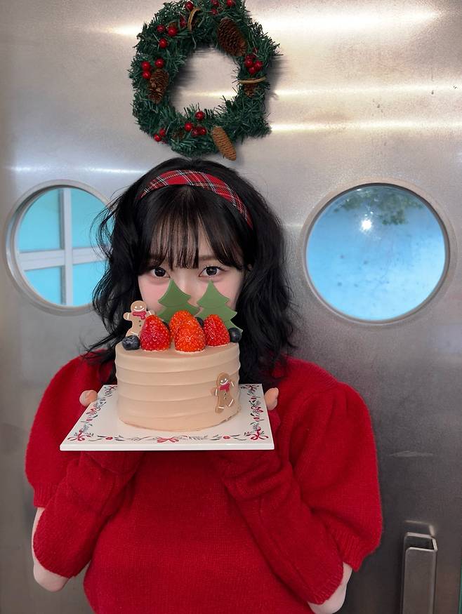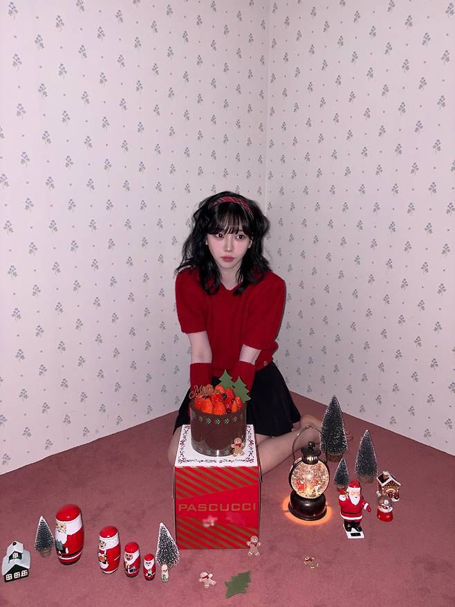 아늑한 홀리데이 분위기 속에서, 카리나는 따뜻한 레드 니트와 함께 사랑스러운 웨이브 헤어를 선보였어요.
