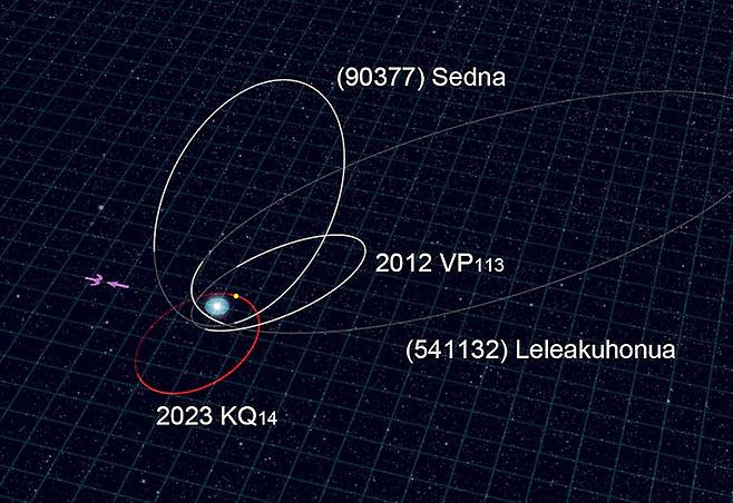 위 사진은 2023 KQ14(빨간색 선)와 앞서 특정된 세드나족 천체 3개의 궤도(백색 선)를 각가 보여준다. 2023 KQ14는 태양으로부터 71천문단위 위치에서 발견됐다. 노란 점은 올해 7월 시점의 위치를 나타낸다.
