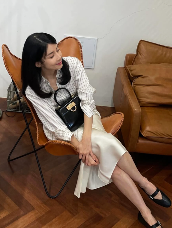 스트라이프 셔츠와 새틴 스커트로 완성한 미니멀 룩