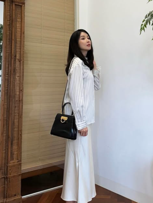 깔끔한 실루엣의 셔츠는 소매를 롤업해 여유로운 무드를 더했고, 무광 새틴 소재의 스커트는 부드러운 곡선을 살리며 우아한 느낌을 강조했다.