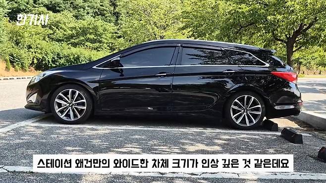 그리고 측면부 보시게 됐을 때 스테이션 왜건만의 와이드한 차체 크기가 인상 깊어요. 그나마 저 같은 경우엔 전면부의 아쉬움을 왜건만의 특별한 측면부 디자인이 보완을 해주지 않나 싶어요. 옆모습이 예뻐 보이는 차 같아요. 이 차량 휠은 순정으로 제공되는 18인치입니다.