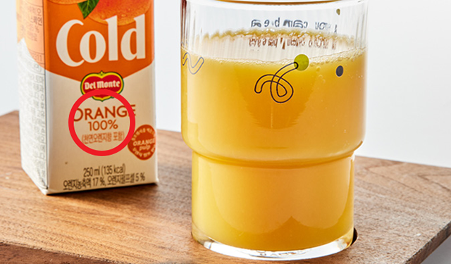 과채음료에서 자주 볼 수 있는 ‘천연과일을 사용한 100% 주스’라는 문구는 어떻게 해석하면 좋을까. 가장 일반적인 해석은 과일이나 채소만 100% 들어갔다는 것이리라. 하지만 과즙만 100% 사용한 음료가 아니더라도 100% 표기는 가능하다. 농축액을 희석해 원상태로 환원한 제품의 경우, 환원된 단일 원재료의 농도가 100% 이상이면 100% 표기를 할 수 있다. 이는 풀어서 말하자면, 물, 당류, 착향료 등을 첨가하더라도 원재료의 농도가 100%라면 100%라 표기할 수 있다는 것이다.
