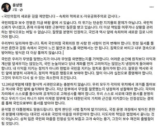 윤 의원은 "어려운 순간에 원칙보다 이익과 계산을 앞세우지는 않았는지, 국민 눈높이보다 당내 계파를 먼저 고려하지는 않았는지 냉정하게 돌아봐야 한다"며 "잘못은 역사와 국민 앞에 분명히 사과하고, 정치적 책임은 행동으로 보여야 한다. 말이 아니라 실천으로 증명해야 한다. 그것이 우리가 다시 설 수 있는 최소한의 조건"이라고 주장했다.