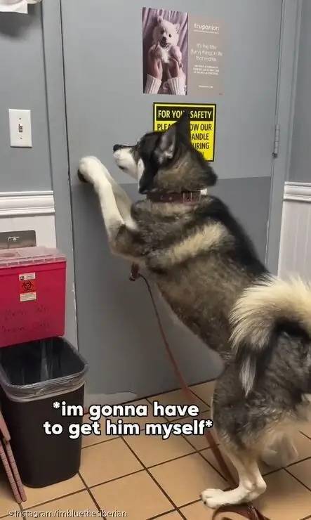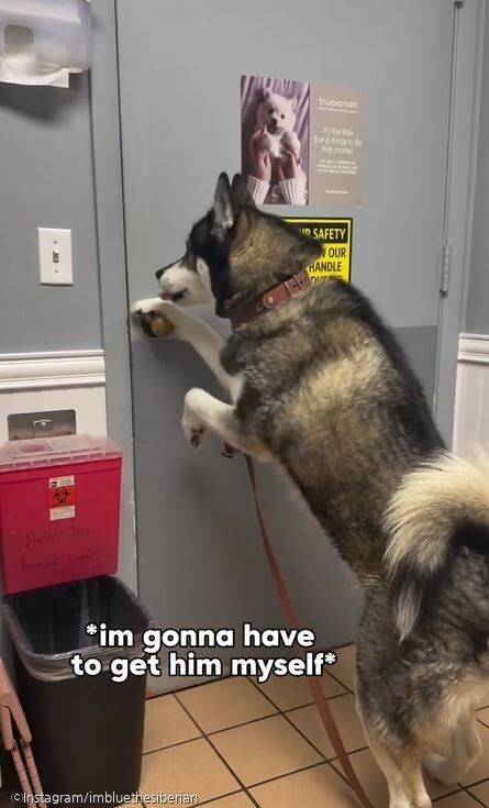 블루를 진료실 밖으로 나가게 해주고 싶었는지 타이탄은 문을 열고자 앞발로 문손잡이를 잡고 낑낑거렸습니다.