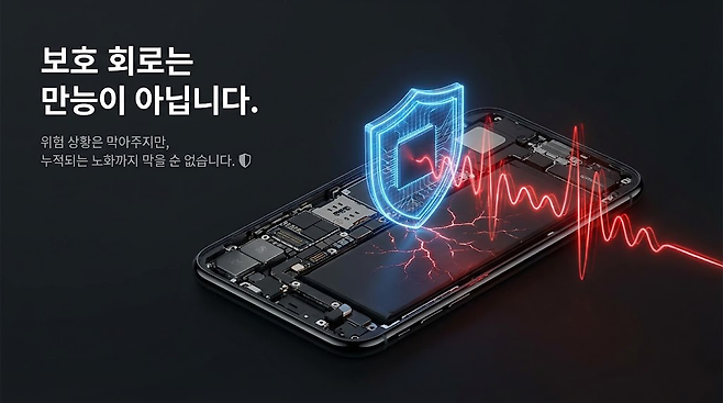 아이폰에는 전압과 전류를 감시하는 보호 구조가 있습니다. 전원 관리 칩이 전압을 체크하고, 배터리 보호 회로가 과열을 막으며, 시스템은 온도에 따라 충전 속도를 조절합니다. 그래서 아이폰은 웬만해선 당장 고장 나지 않습니다. 다만 전력이 불안정한 상태가 반복되면, 충전을 막았다가 다시 허용하는 동작이 계속 일어나게 됩니다. 이 차단과 재개가 누적되면 충전 포트와 배터리 내부, 충전 IC가 조금씩 스트레스를 받게 되고, 그 결과가 배터리 수명 저하로 나타납니다.