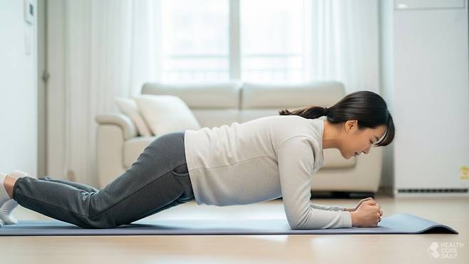 니 플랭크는 무릎을 바닥에 댄 상태에서 실시하는 플랭크 동작으로, 코어 운동을 처음 시작하는 사람도 부담 없이 접근할 수 있는 기초 운동이다. 이 운동은 팔꿈치로 상체를 지지한 채 몸통을 고정하는 과정에서 복직근과 척추기립근이 활성화돼 몸의 중심을 안정적으로 잡아준다. 특히 척추를 둘러싼 근육을 강화해 자세가 흐트러지는 것을 막아주며, 장시간 앉아 생활하며 생기기 쉬운 목·어깨 불균형이나 허리 통증 완화에도 좋은 영향을 준다.