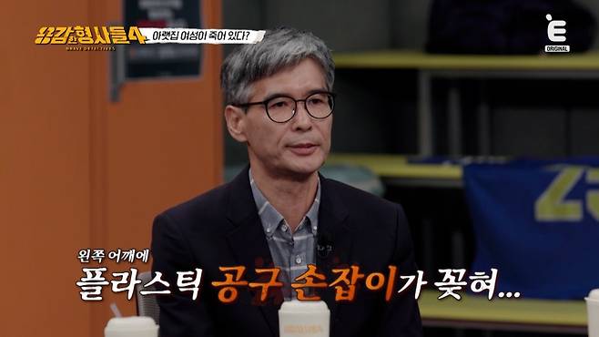 왼쪽 어깨에는 공구 손잡이만 보이게 깊숙이 꽂혀 있었는데,