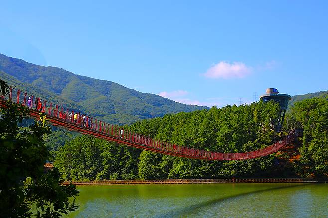 특히 호수를 가로지르는 220m 길이의 '출렁다리'는 스릴 넘치는 체험과 함께 주변 풍경을 한눈에 감상할 수 있는 최고의 포토존으로 인기를 끌고 있다.