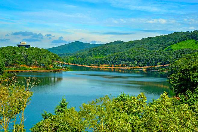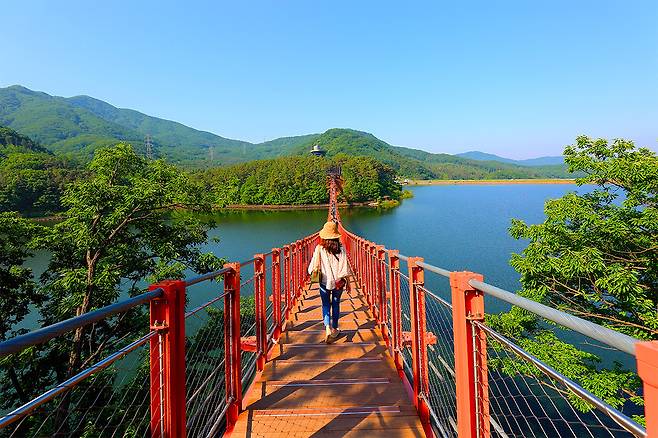 이 출렁다리는 호수를 가로지르는 형태로 자리 잡고 있어 한가운데에 서면 양쪽으로 탁 트인 물빛을 감상할 수 있다.
