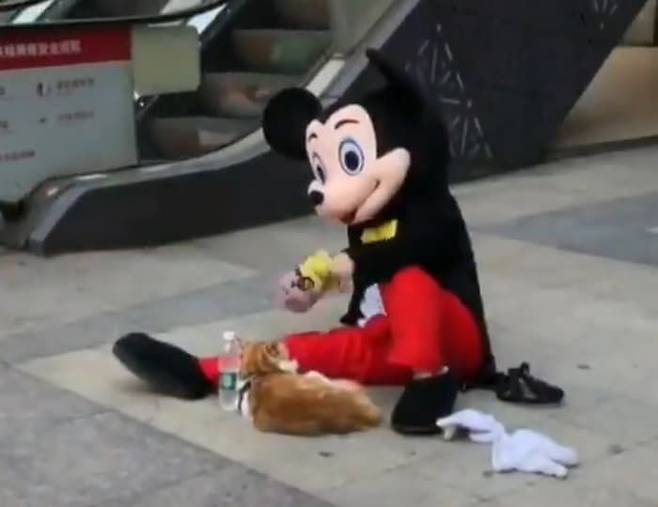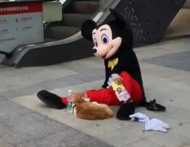 고양이가 더운 날씨에 지쳤을까봐 걱정이라도 됐는지 고양이에게 손부채질을 해주는 미키마우스 탈인형 아르바이트생의 모습이 잔잔한 감동을 주고 있습니다.