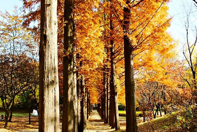 양재시민의숲 바로 옆에 위치한 서초 문화예술공원은 높이 솟은 메타세쿼이아 나무 모양의 이모티콘 길로 많은 연인들의 발길을 끌고 있는 서울의 단풍 명소인데요. 메타세쿼이아의 단풍은 황홀하며 이곳에 찍는 소중한 사진은 평생 갈 수 있죠.