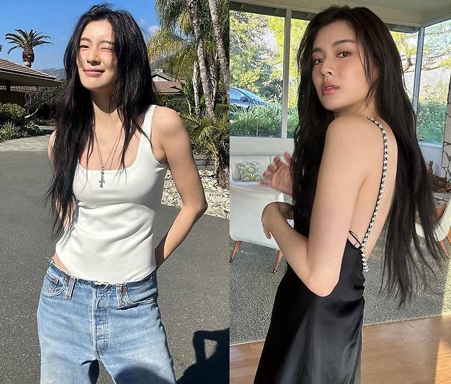 등 라인이 깊게 파인 디자인과 장식 체인이 시선을 사로잡으며, 그녀의 고급스러운 실루엣과 세련된 분위기를 강조했습니다.