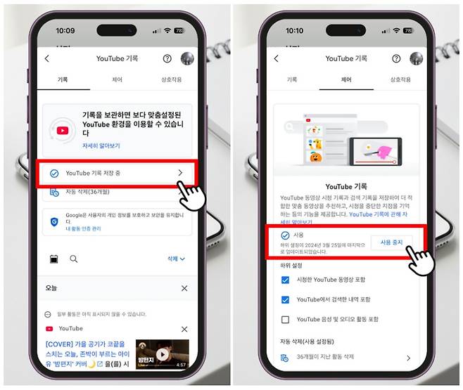 만약 유튜브 검색기록과 시청기록이 자동으로 저장되는게 불편하다면 이렇게 해보세요.