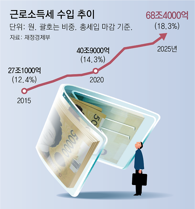 이런 탓에 최근 10년 새 전체 국세 수입이 늘어나는 속도보다 근로소득세가 늘어나는 속도가 2배 이상 빨랐다. 국세 수입은 2015년 217조9000억 원에서 2025년 373조9000억 원으로 71.6% 늘었다. 이 기간 근로소득세는 27조1000억 원에서 68조4000억 원으로 152.4% 불어났다.