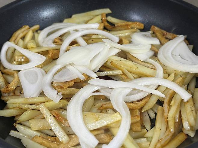 감자가 80% 정도 익으면 얇게 채 썬 양파를 넣고 볶아 주세요. 양파는 금방 익기 때문에 거의 마지막에 넣어서 숨만 죽을 정도로 볶으세요.