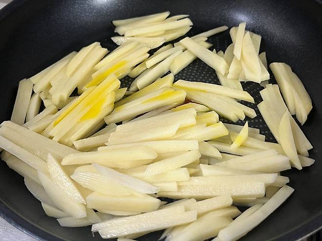 오일을 두르고 채 썬 감자를 중 약불에서 볶으세요. 감자는 익는 데 시간이 조금 걸리기 때문에 조리시간을 단축하고자 한다면 한 번 데쳐서 볶아도 좋습니다.