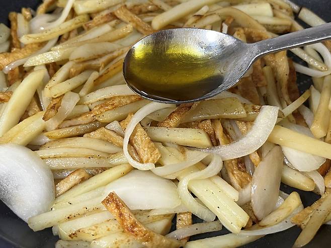 마지막으로 참기름 1스푼 둘러서 마무리합니다. 참기름은 1스푼이 적당하며 너무 많이 넣으면 오히려 느끼하고 감자의 맛을 가리게 됩니다.