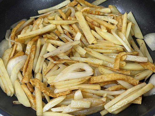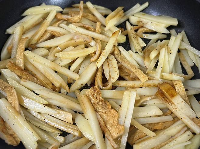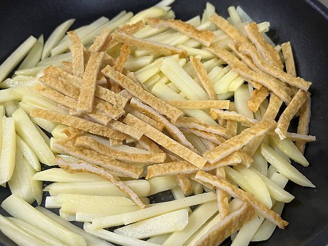 채 썬 어묵을 넣어 주세요. 감자만 넣고 볶는 것보다 어묵이나 햄 등을 넣어주면 감자의 담백한 맛에 감칠맛이 더해져 훨씬 맛이 살아납니다.
