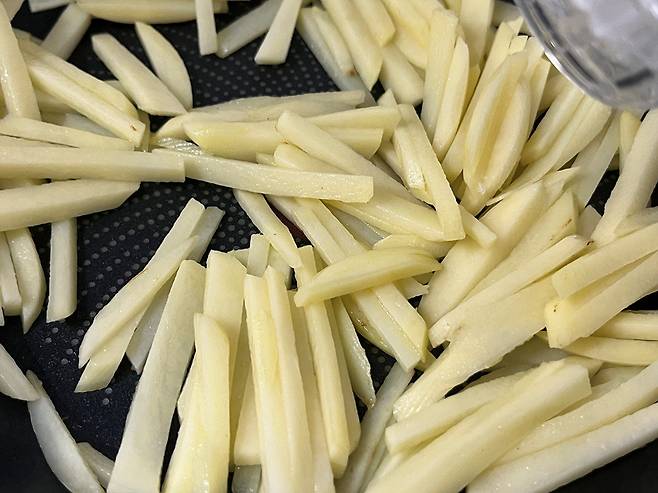 감자는 무조건 소금으로 밑간을 하면서 볶아야 합니다. 그래야 감자 본연의 고소함과 단맛이 살아납니다. 소금 5~6꼬집을 넣고 밑간을 하면서 볶으세요.