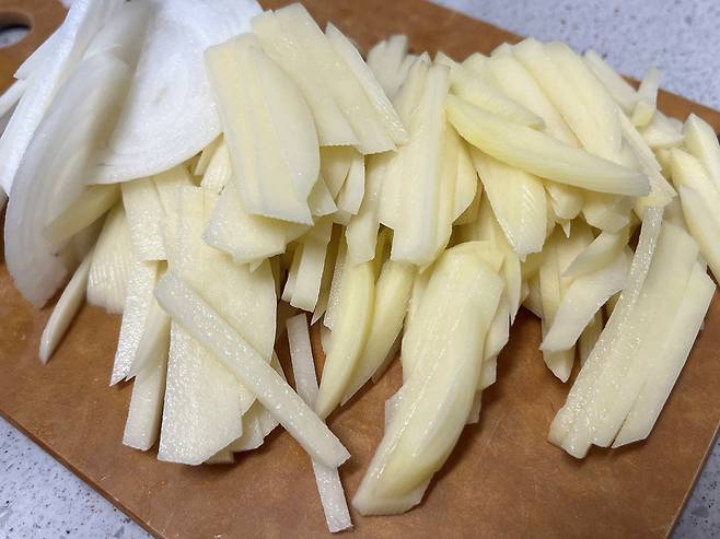 감자 2개를 껍질을 벗기고 얇게 채 썰어 주세요. 두께는 약 2~3mm 정도가 가장 좋습니다. 이 정도 두께면 볶았을 때 부서지지 않고 적당합니다. 양파도 함께 채 썰어서 준비하세요.