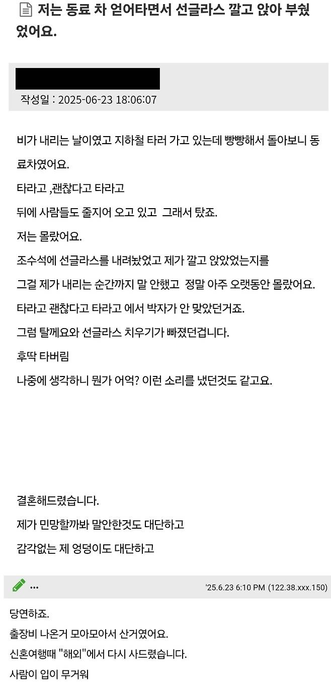 동료 차 얻어 타면서 선글라스까지 부신 사람