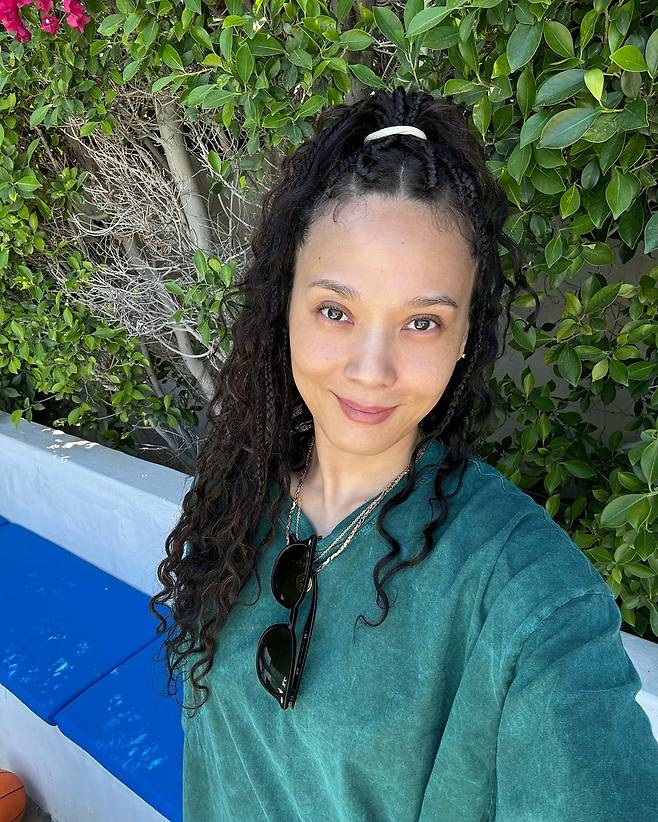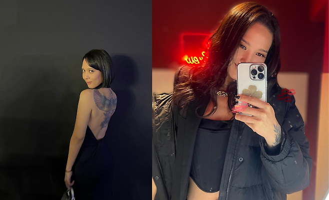 등 라인이 드러나는 블랙 드레스로 우아한 실루엣을 강조하고 있다. 등에 새겨진 날개 문신과 함께 미니멀한 블랙 드레스의 조화가 세련된 분위기를 연출하고 있다.