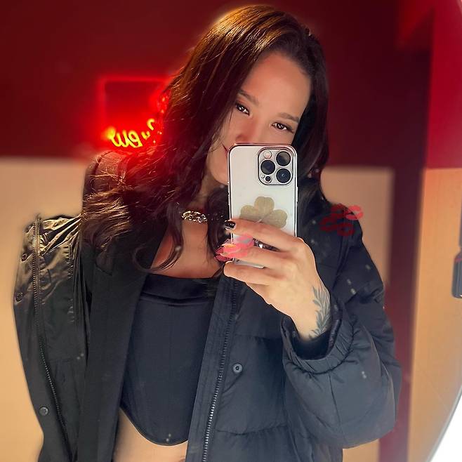 검은색 패딩 재킷과 크롭탑을 매치한 캐주얼한 스트리트 패션을 선보이고 있다. 붉은 네온사인을 배경으로 한 셀피에서 블랙 컬러의 의상과 자연스러운 웨이브 헤어스타일이 도시적인 분위기를 자아내고 있다.